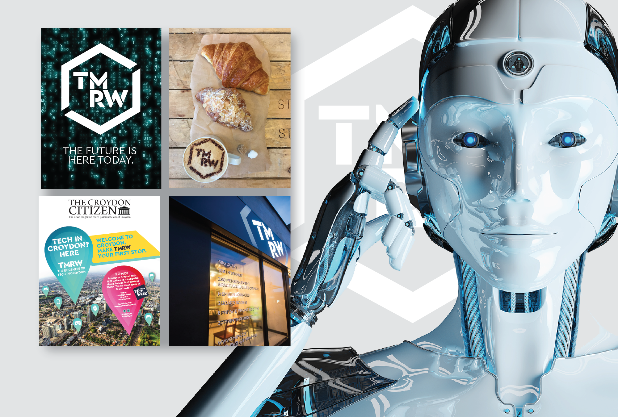 Brand identity and interior graphic design for Croydon’s innovation hub, TMRW. Studio GLUE was a part of the multi-disciplinary designers putting together not only the visual and communications identity, but creating a cool ambience for the co-workspace.