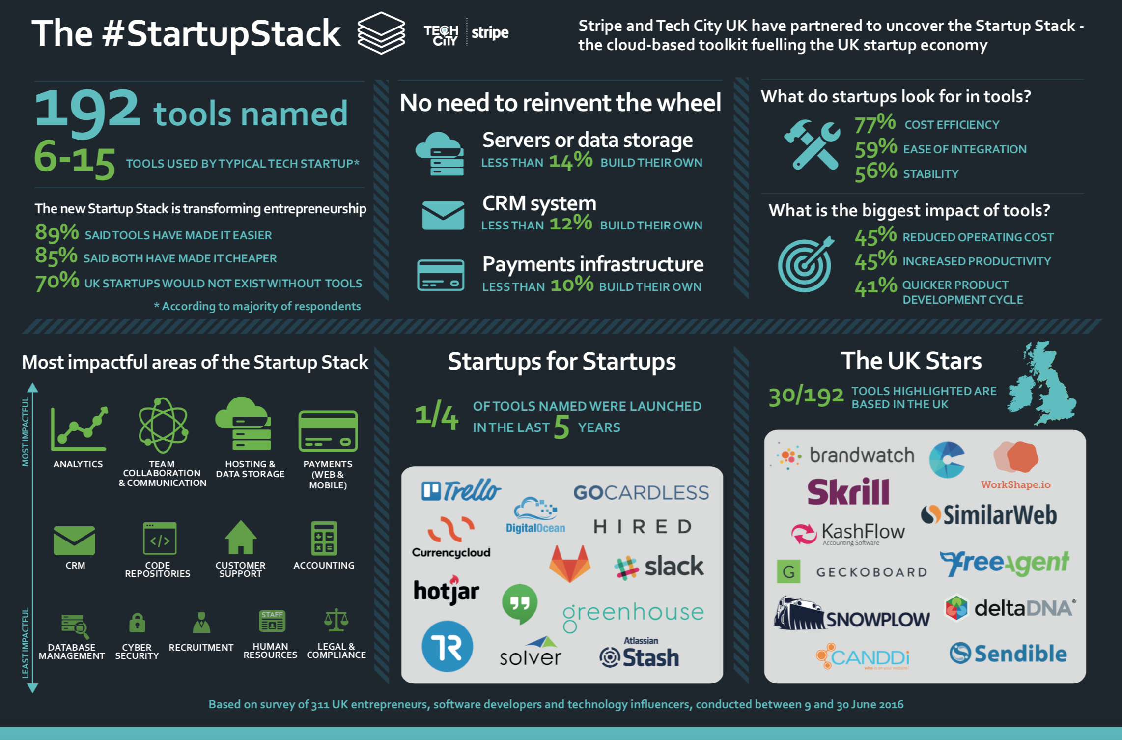 What digital tools does a UK startup need to get going? In 2016, Tech City UK published a joint research with Stripe, the payments company, identifying a new ‘Startup Stack’, a suite of cloud-based tools that can be used to support the operations of a new UK business.